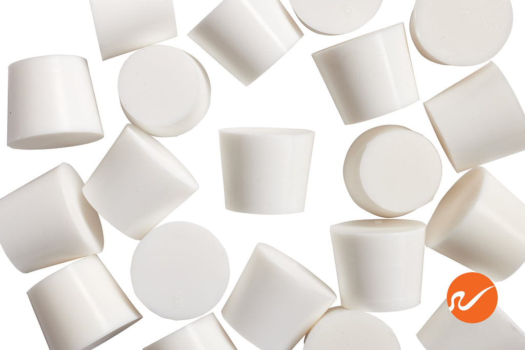 Size 6 White Silicone Rubber Stoppers are tapered Rubber Stoppers that will plug many kinds of containers, lab vials and other openings. Manufactured from Silicone Rubber. Suitable for many high-temperature industrial applications. Bulk available.