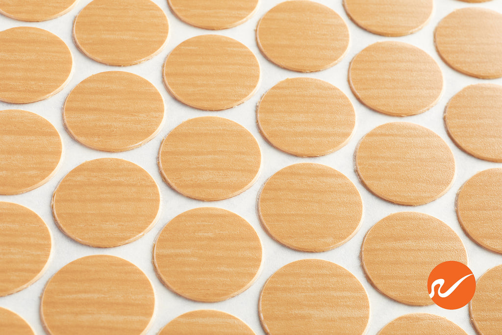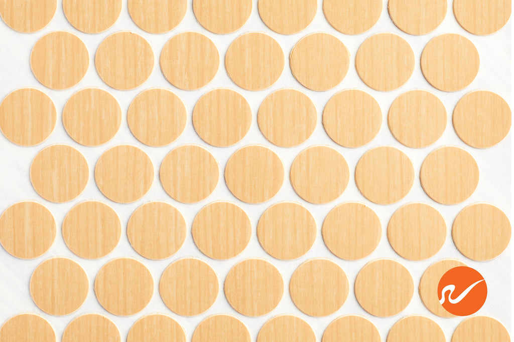 American Maple Fastcaps adhesive screw covers work great to conceal your countersunk screws on cabinets, furniture, point of purchase displays and elsewhere. Fastcaps simply peel and stick on to add a finishing touch! American Maple Fastcaps are 9/16" diameter and just 1/32" thick. Material is high impact PVC plastic. The adhesive will cure and get stronger over time. Also, adhesive is waterproof when applied to a clean dry surface and allowed to cure. Bulk available.