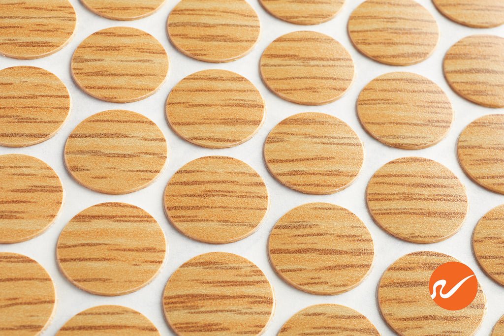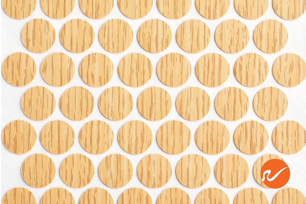 Golden Oak Fastcaps self adhesive screw covers work great to conceal your countersunk screws on cabinets, furniture, point of purchase displays and elsewhere. Fastcaps simply peel and stick these caps to add a finishing touch! Golden Oak Fastcaps are 9/16" diameter and just 1/32" thick. Material is high impact PVC plastic. The adhesive will cure and get stronger over time. Also, adhesive is waterproof when applied to a clean dry surface and allowed to cure. Bulk available.