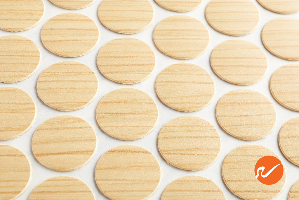 Knotty Pine Fastcaps adhesive screw covers work great to conceal your countersunk screws on cabinets, furniture, point of purchase displays and elsewhere. Fastcaps simply peel and stick on to add a finishing touch! Knotty Pine Fastcaps are 9/16" diameter and just 1/32" thick. Material is high impact PVC plastic. The adhesive will cure and get stronger over time. Also, adhesive is waterproof when applied to a clean dry surface and allowed to cure. Bulk available.