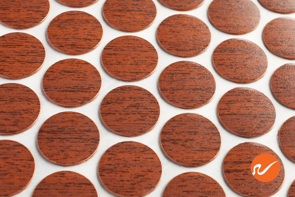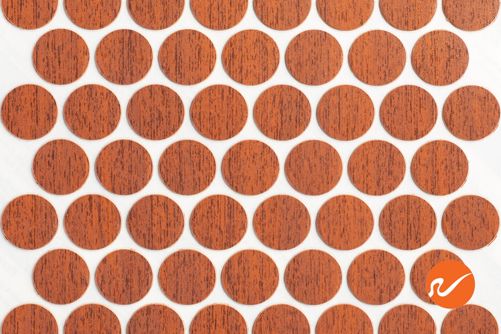 Medium Cherry Fastcaps adhesive screw covers work great to conceal your countersunk screws on cabinets, furniture, point of purchase displays and elsewhere. Fastcaps simply peel and stick on to add a finishing touch! Medium Cherry Fastcaps are 9/16" diameter and just 1/32" thick. Material is high impact PVC plastic. The adhesive will cure and get stronger over time. Also, adhesive is waterproof when applied to a clean dry surface and allowed to cure. Bulk available.