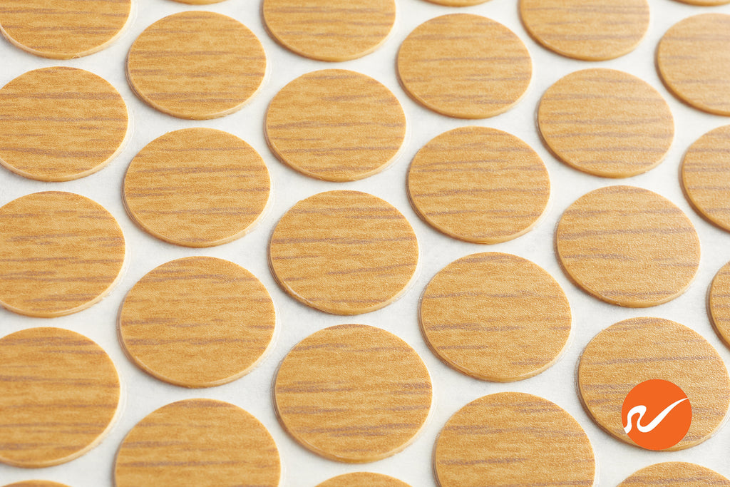 Natural Oak Fastcaps adhesive screw covers work great to conceal your countersunk screws on cabinets, furniture, point of purchase displays and elsewhere. Fastcaps simply peel and stick on to add a finishing touch! Natural Oak Fastcaps are 9/16" diameter and just 1/32" thick. Material is high impact PVC plastic. The adhesive will cure and get stronger over time. Also, adhesive is waterproof when applied to a clean dry surface and allowed to cure. Bulk available.