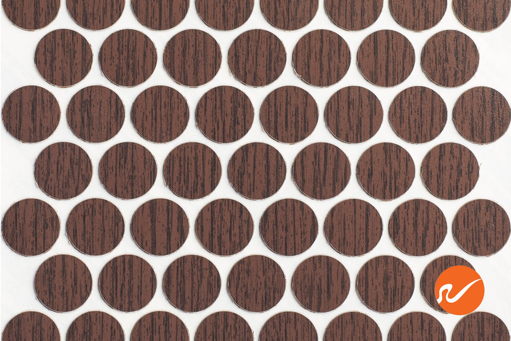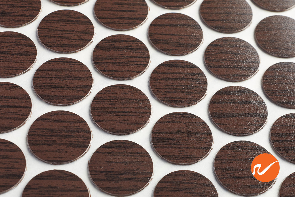 Presidential Walnut Fastcaps adhesive screw covers work great to conceal your countersunk screws on cabinets, furniture, point of purchase displays and elsewhere. Fastcaps simply peel and stick on to add a finishing touch! Presidential Walnut Fastcaps are 9/16" diameter and just 1/32" thick. Material is high impact PVC plastic. The adhesive will cure and get stronger over time. Also, adhesive is waterproof when applied to a clean dry surface and allowed to cure. Bulk available.