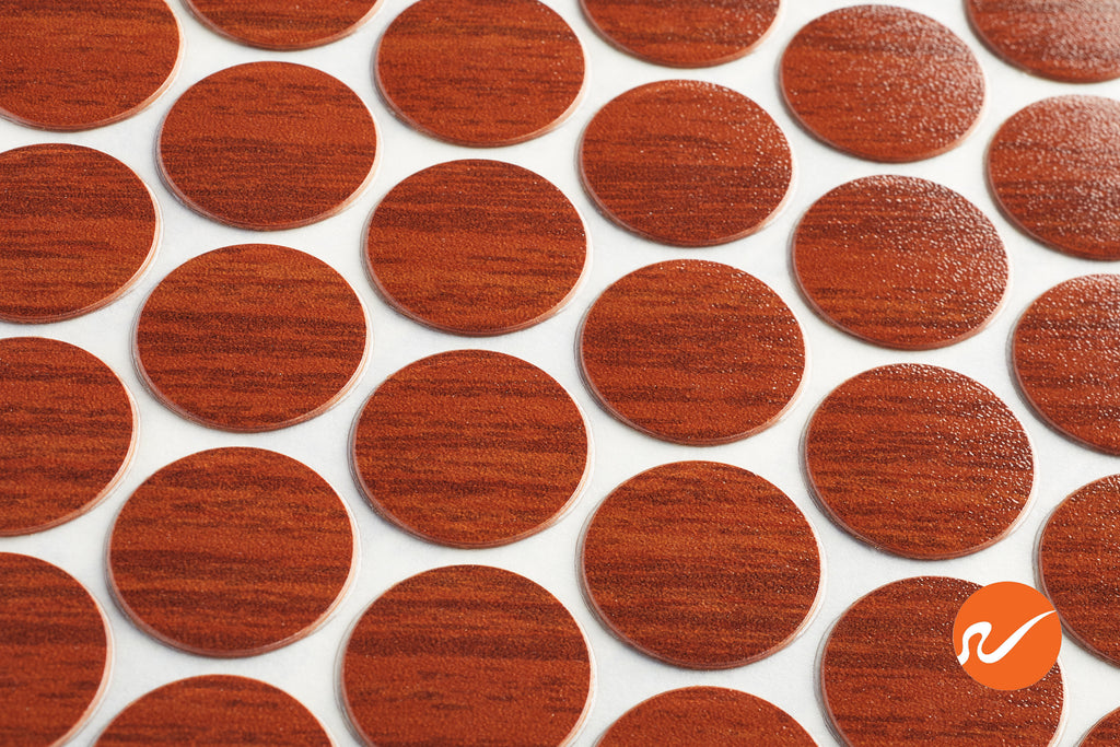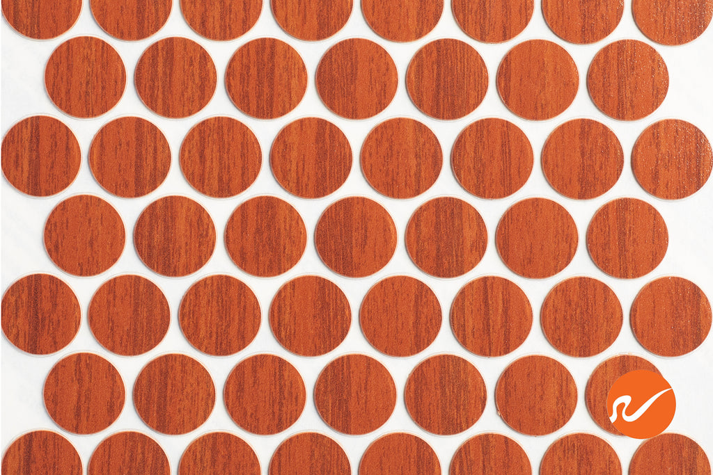Select Cherry Fastcaps adhesive screw covers work great to conceal your countersunk screws on cabinets, furniture, point of purchase displays and elsewhere. Fastcaps simply peel and stick on to add a finishing touch! Select Cherry Fastcaps are 9/16" diameter and just 1/32" thick. Material is high impact PVC plastic. The adhesive will cure and get stronger over time. Also, adhesive is waterproof when applied to a clean dry surface and allowed to cure. Bulk available.